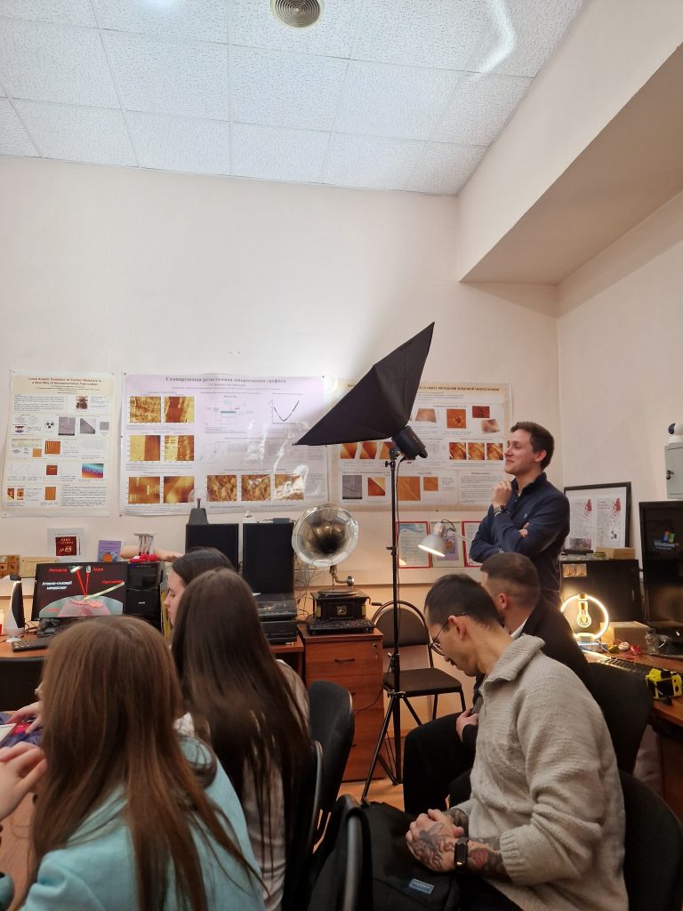 Мы по традиции рассказали ребятам о принципах работы атомно-силового микроскопа, научили их делать 3D сканирование соседа, крутить магнитный спиннер и объяснять, почему лампа левитирует.